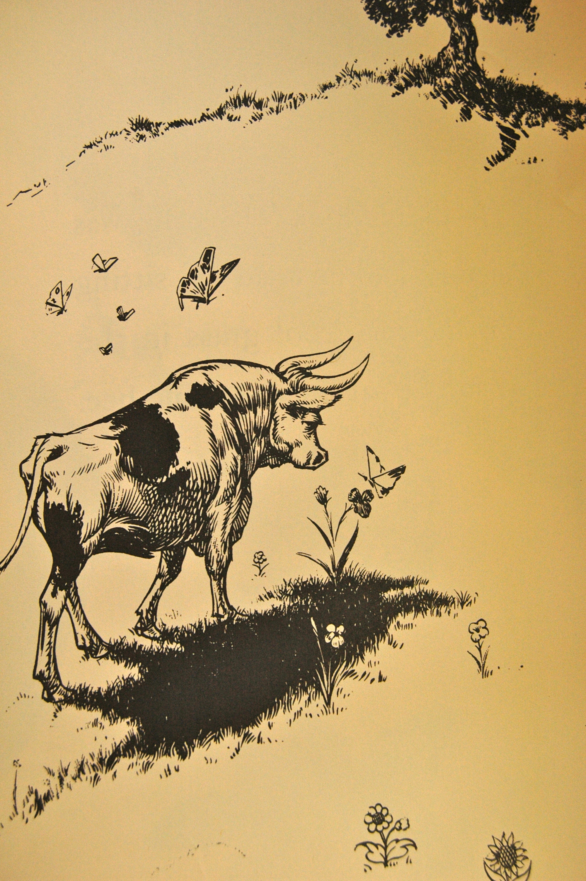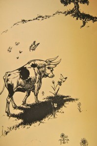 Short statements, happy ending, perfect. But deceptively so. Published in 1936, the text has been called a Pacifist statement (for the obvious reason that Ferdinand wins by doing nothing), and when it was released, it was banned from right wing countries (such as, duh, Franco’s Spain). The style of the writing reflects this sentiment of pacifism. Throughout, Leaf Munroe mostly keeps his distance from his characters’ heads, and this saves the story from feeling like a problem-solving 101. It isn’t the author jumping up and down and saying, these other bulls and people are being bad! Poor Ferdinand! In fact, you don’t every really feel bad for Ferdinand (except maybe at his wide eyes when he sits on the bee). So you, the reader, are left