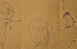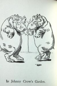 two hippopotami. As each animal caters to the stereotype of a dinner guest, they also cater to his or her own stereotype: the cat is after the mouse, the goose is stupid, the goat wise, the fox crafty, and the crow… well Johnny is the glue that holds them all together. A verifiable zoo brought to harmony through the efforts of the gracious and ameliorative host, releasing his guests from the fox’s stocks, listening to ALL of the whale’s long tale, diverting the cat from the mouse with a saucer of milk, and providing the poor naked bear with a coat. It is an absurd world and one children would adore. Yet, as far as I can tell, despite being the namesake for a number of preschools across the country, this is catered to children only in it’s pure absurdity. But for us big people, wise enough to see both its fun and its humor, it resonates even more deeply.