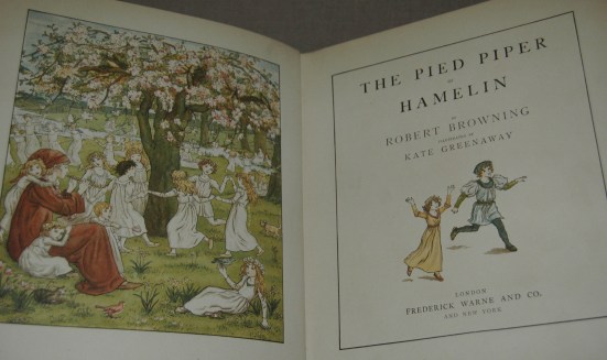 The books on display range from as early as 1870 to as late as 1900, and they vary in theme and color quality. Children’s books were meant to impose “socially acceptable behavior while providing entertainment.” Sounds familiar. Many of the display books are about fairies and nursery rhymes such as the Pied Piper (written by Robert Browning!), Old Mother Hubbard, The Queen of Hearts, and various alphabet books. There was even a Babies Opera. In fact, it was surprising how many of the 16 stories were familiar. So of course, it was the one’s that weren’t that I found the most intriguing (though Caldecott’s Queen of Hearts and Greenaway’s Pied Piper are mind-blowingly elegant).