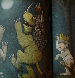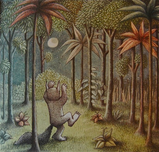 Maybe I’m just speaking for myself, but I imagine that its not Max’s caving in that has appealed to readers for so long. It’s really all about the wild rumpus. The pictures without words, the total abandonment of reason and logic and the indulgence of the party. The Bacchanalian ritual of dealing with emotion. Are we supposed to leave this book thinking, yeah Max, go home! Stop being king of the Wild Things and go listen to your mom! Really, it’s the kind of moral that we hate from over here in the adult world of lost wild things. Its the memory of