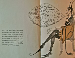 “The devil mostly speaks a language of his own called Bellsybabble which he makes up himself as he goes along but when he is very angry he can speak quite bad French very well though some who have heard him say he has a strong Dublin accent.”