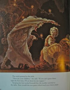ever seen in the world of kids books. Detailed, expressive, perfectly lighted, and horrifying, they’re… alive, his faces move on the page. His children dance with fire, his witch grows and shrinks as she reaches for a child pudding and cowers at the feet of an enraged mother… You can tell I want to rage and glow about its awesomeness, but really, the very reason for the pictures is the way they express things without words. Just go check it out. I promise that when and if you do, you are going to feel pretty excited. Definitely at the pictures. But also… with the whole thing. Whether its the nostalgia of an older art form- both in the quality of the drawings and the fairy-tale format- or just the thrill of coupling the dark and the childish, when I reintroduce this book to people who read it when they were kids, they get that flash of excitement and fear in their sparkling little eyes. Without fail. It packed a punch on impressionable minds. And still does.