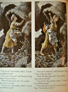With Heckedy Peg, Audrey Wood wrote a proper fairy tale. It’s dark and frightening, but in the end, the magic and terror are all dismissed through ingenuity, a moral is conveyed, and we are left with the black and white triumph of maternal good over a barren evil. Proper. That said, the story itself doesn’t really push boundaries in such a way that makes it stand out (though, I do laud Mrs. Wood for the bad-ass heroine mama and the bravery of calling back on this dark and disturbing genre for kids). I’d say that in this case, the crucial role of the plot lies in the legs it gives the illustrations to stand on, the way it couples perfectly with its other half. And, admittedly, the paintings are so good that it’s tempting to give the illustrations all the credit for Heckedy Peg’s success. But come on. It’s nigh impossible to imagine a successful illustrated book that has a gimping, limping other half.